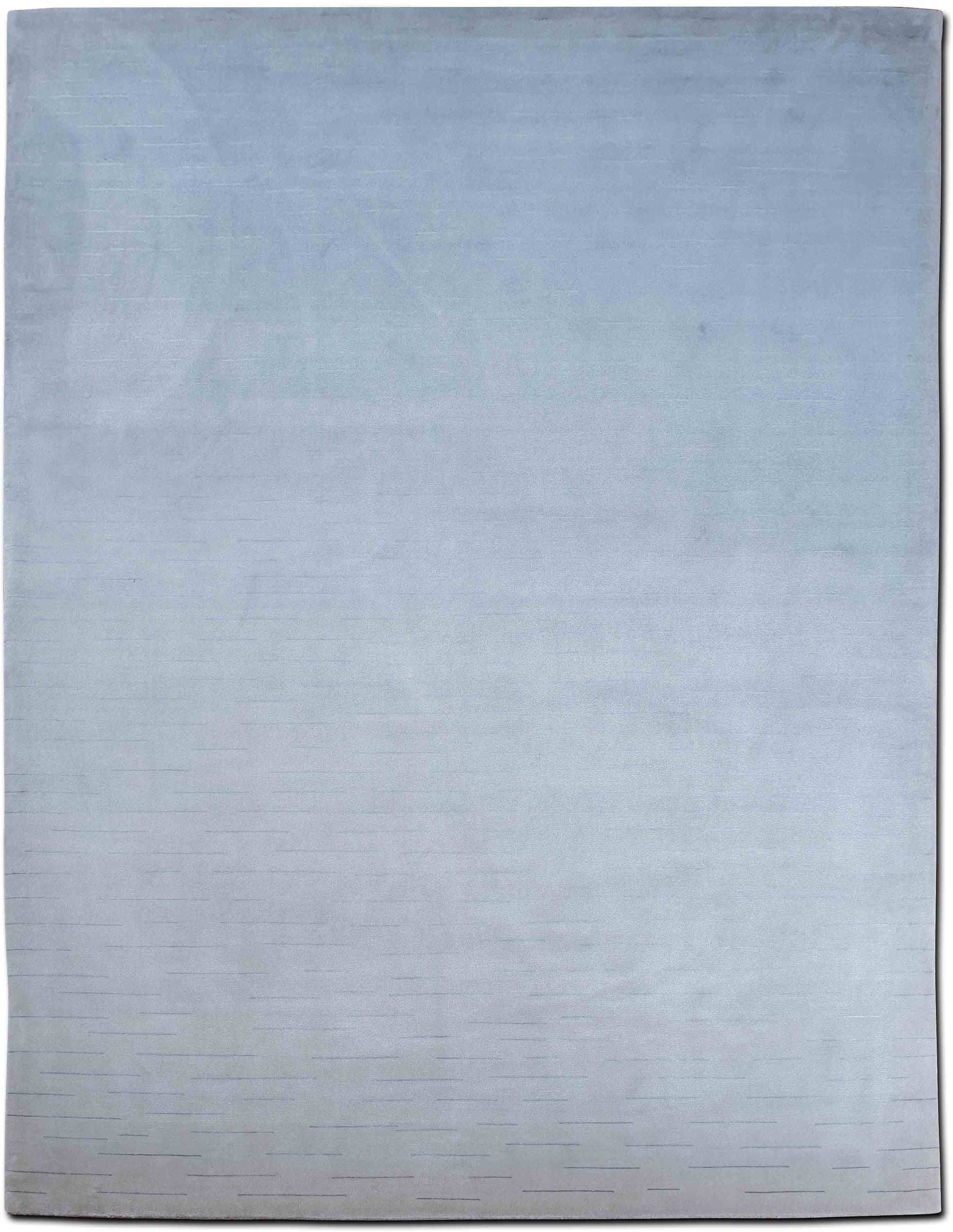 This elegant area rug embodies minimalist sophistication with its serene gradient wash, transitioning from a cool sky blue to a soft silver mist. The barely-there linear etchings near the base add quiet depth and movement, making it a masterclass in understated luxury.