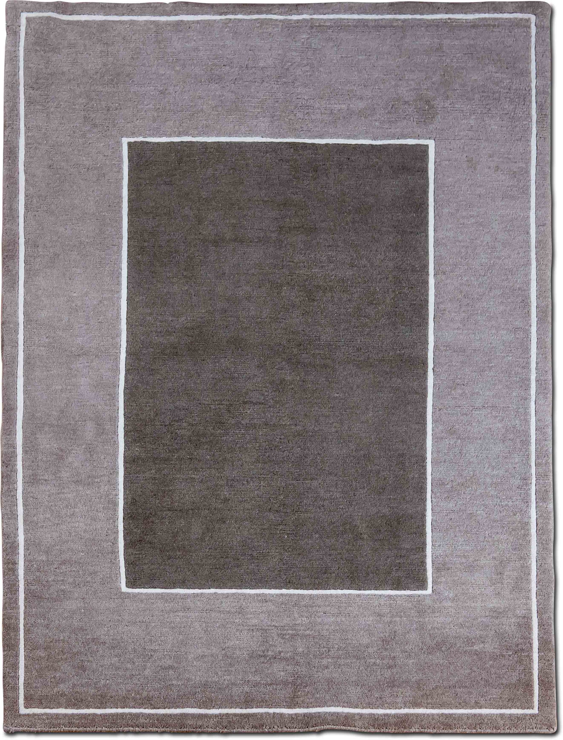 Refined in its simplicity, this hand-knotted wool and silk rug offers a minimalist aesthetic with a luxurious touch. Featuring a two-tone color block design in charcoal and dove grey, outlined by subtle ivory borders, this piece provides clean symmetry and understated elegance—ideal for contemporary and transitional interiors alike.