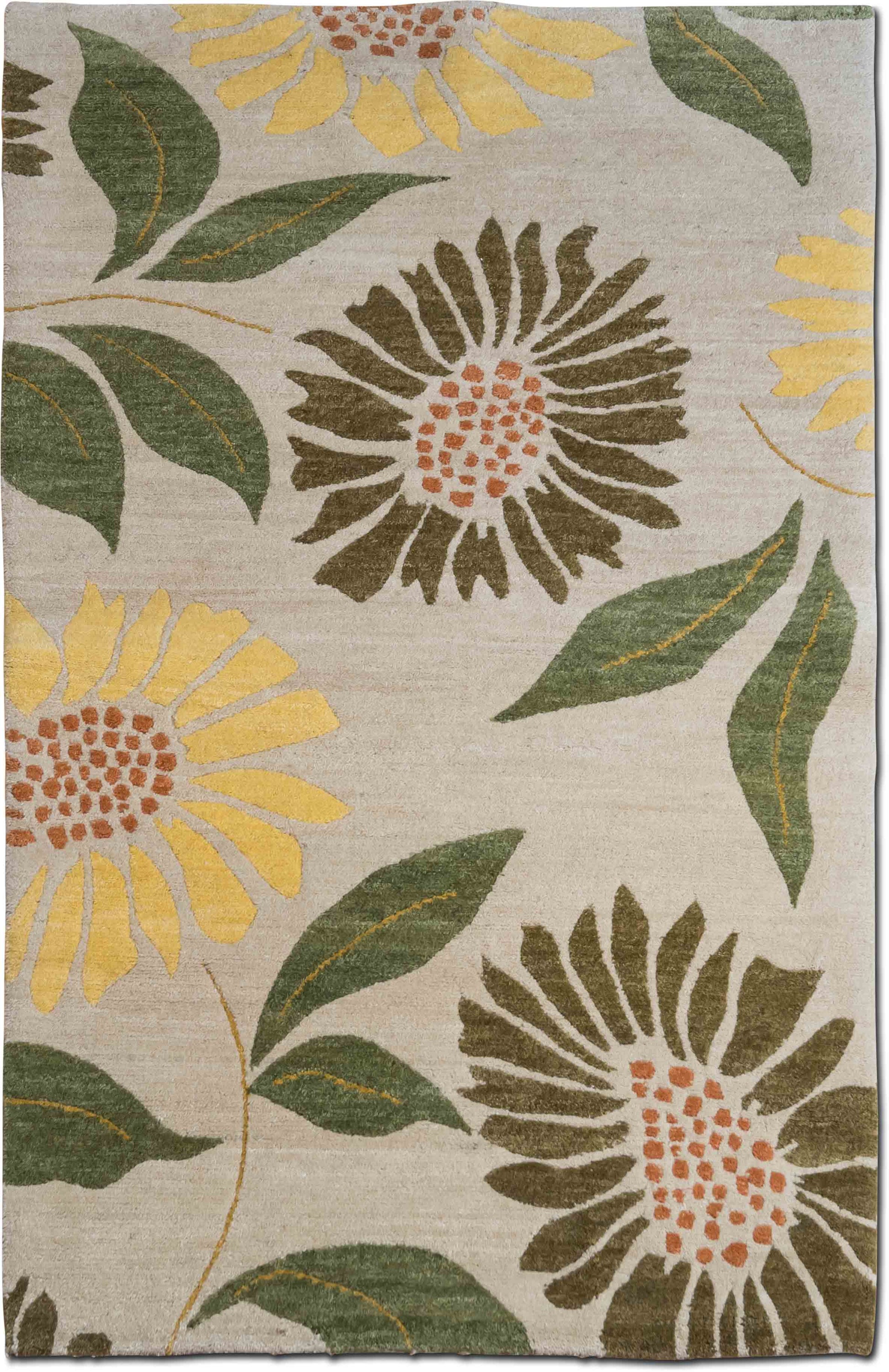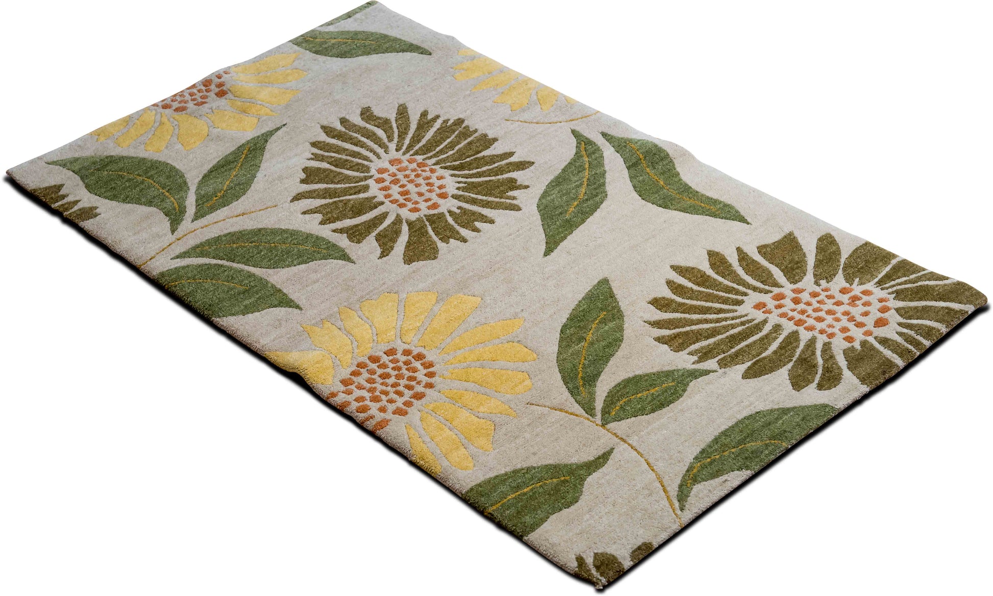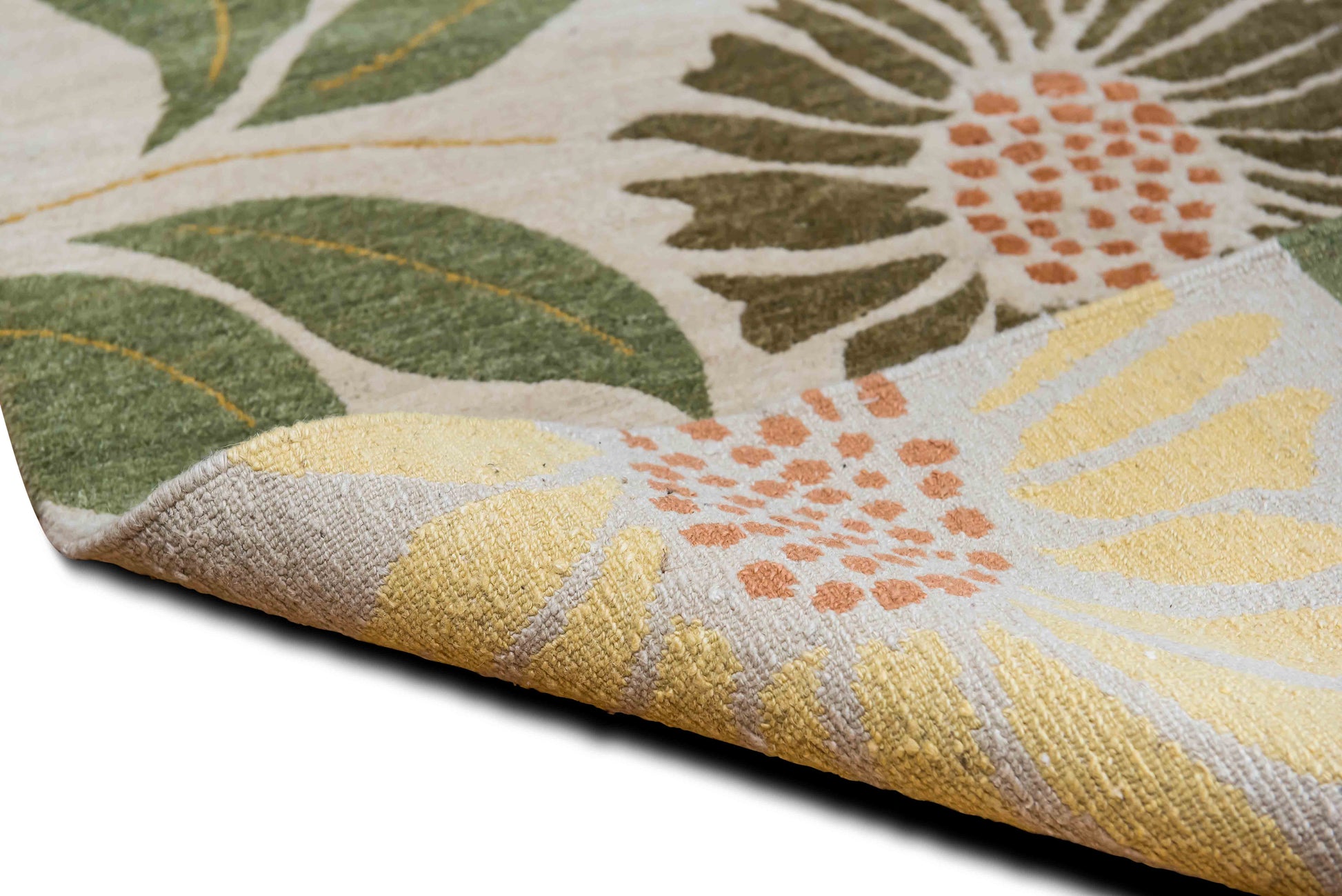 Bursting with the joyful energy of a summer garden, this hand-knotted wool rug features oversized sunflowers in golden yellow and earthy olive green, set against a warm ivory-beige backdrop. The bold floral motifs and expressive leaf details lend a whimsical yet elegant character to any space.