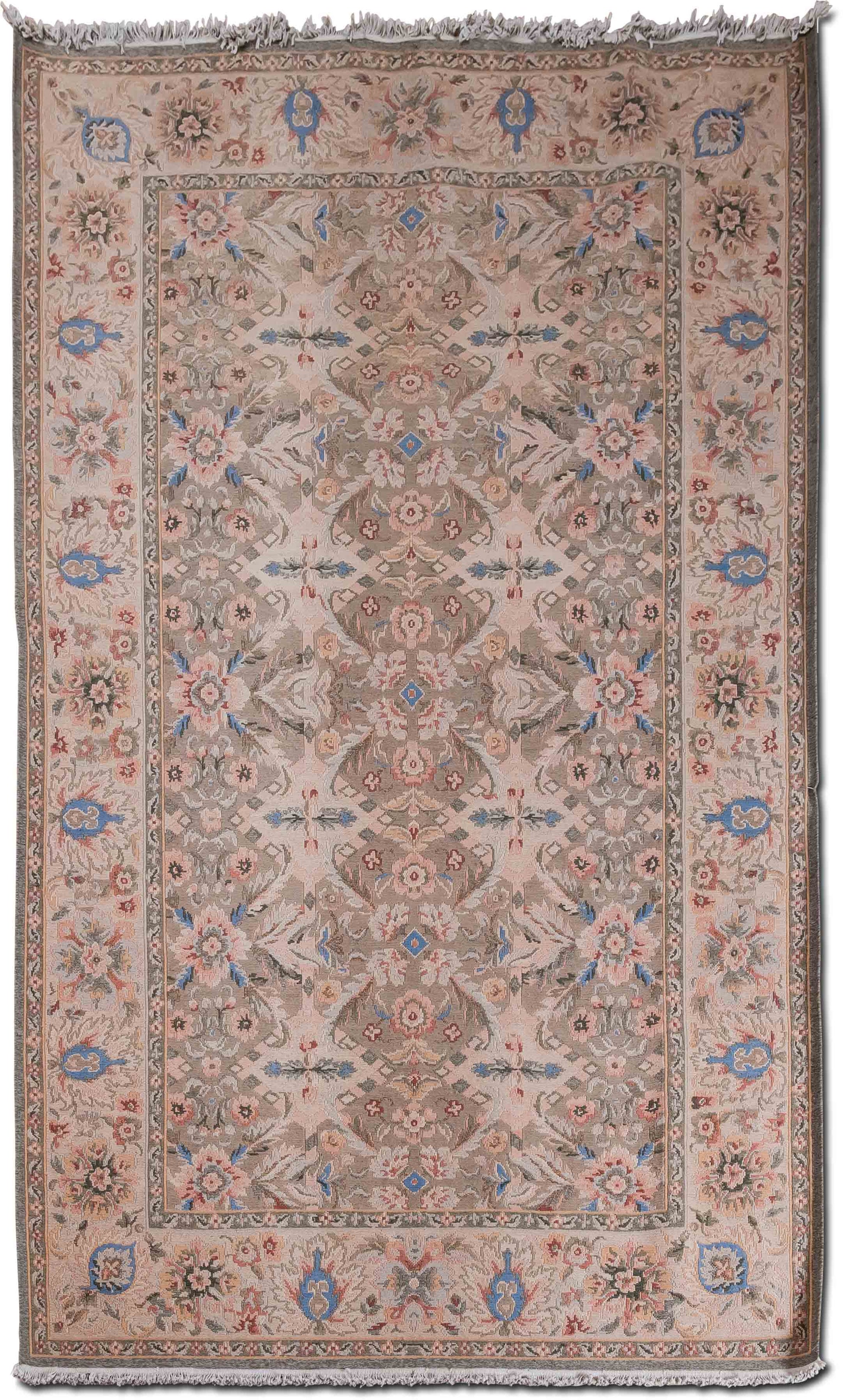 Graceful and intricately detailed, this hand-knotted wool rug features a classic floral design rendered in soft, airy tones. The balanced symmetry and ornate border evoke traditional European and Persian aesthetics, while the muted color palette keeps it light and versatile.