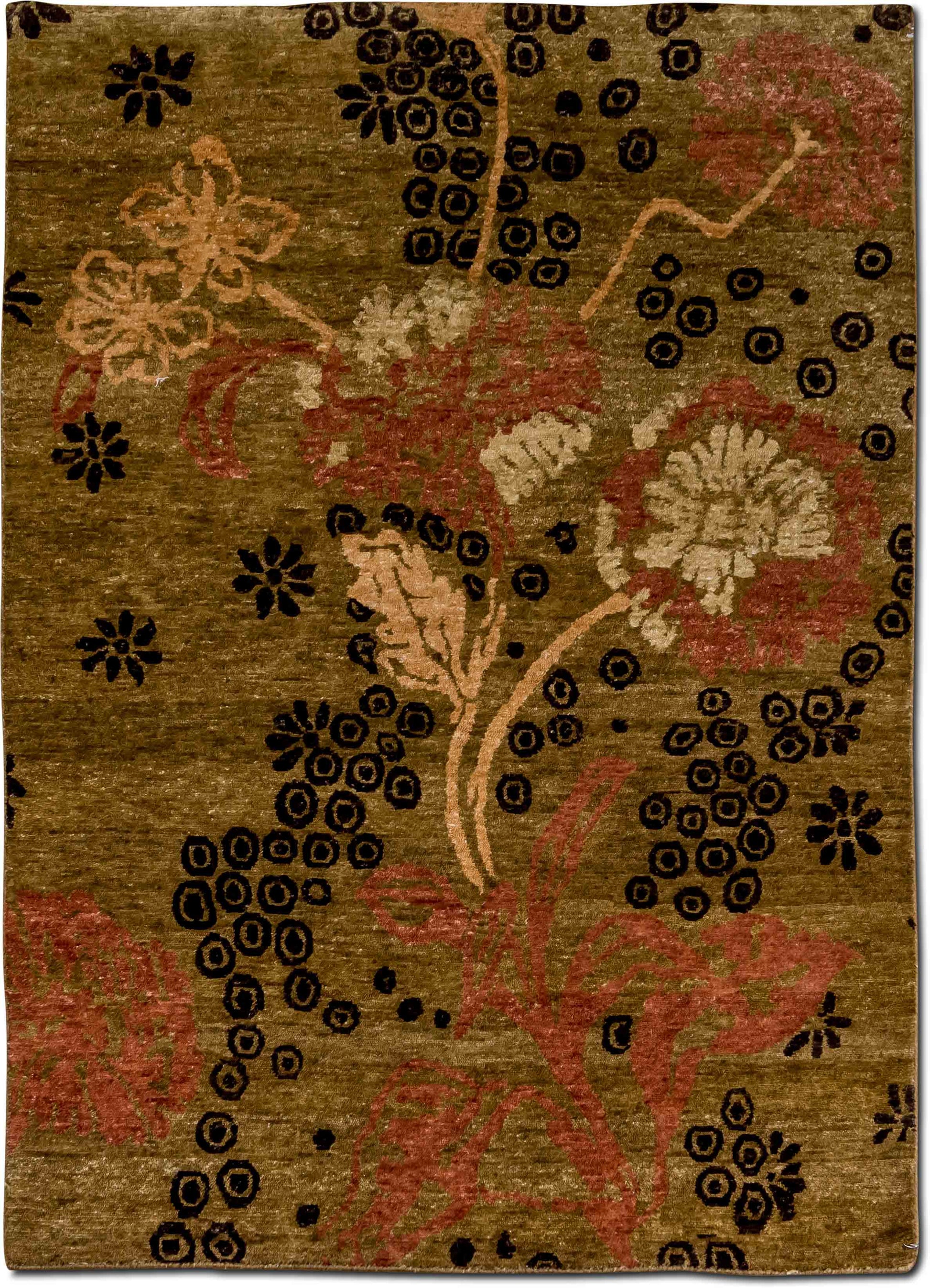 This elegant Feizy hand-knotted rug features a distinctive floral motif that merges traditional botanical elements with modern artistry. Set against an olive-toned background, the composition showcases stylized poppies and abstract blooms in muted rose, ivory, and charcoal—creating a warm, layered design with visual depth and organic movement.