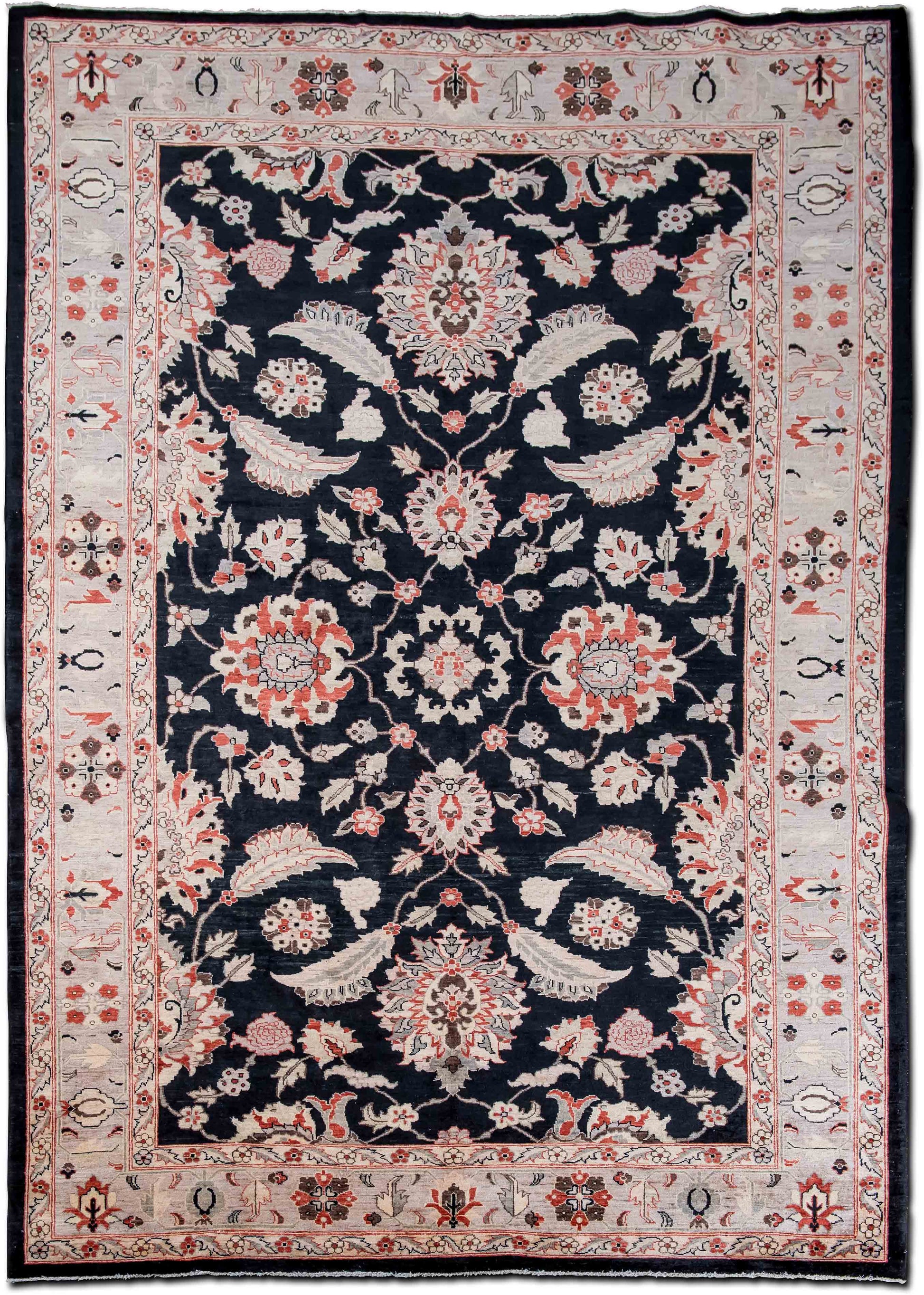 This hand-knotted wool rug showcases the grandeur of traditional craftsmanship, featuring a bold navy field elegantly contrasted by a wide ivory border. Intricate floral medallions and scrolling vines in soft coral, rose, and taupe tones lend the piece a timeless elegance rooted in Persian design heritage.