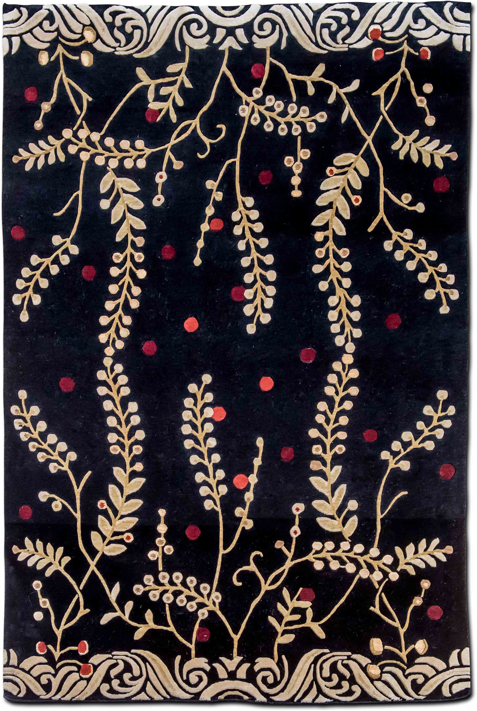 This captivating hand-knotted wool rug showcases an elegant interplay of traditional motifs with a whimsical twist. Flowing golden vines and leaves dance across a dramatic black field, punctuated by scattered red and burgundy accents for a touch of playful contrast. A sculpted scroll border frames the composition, lending an old-world charm with contemporary flair.