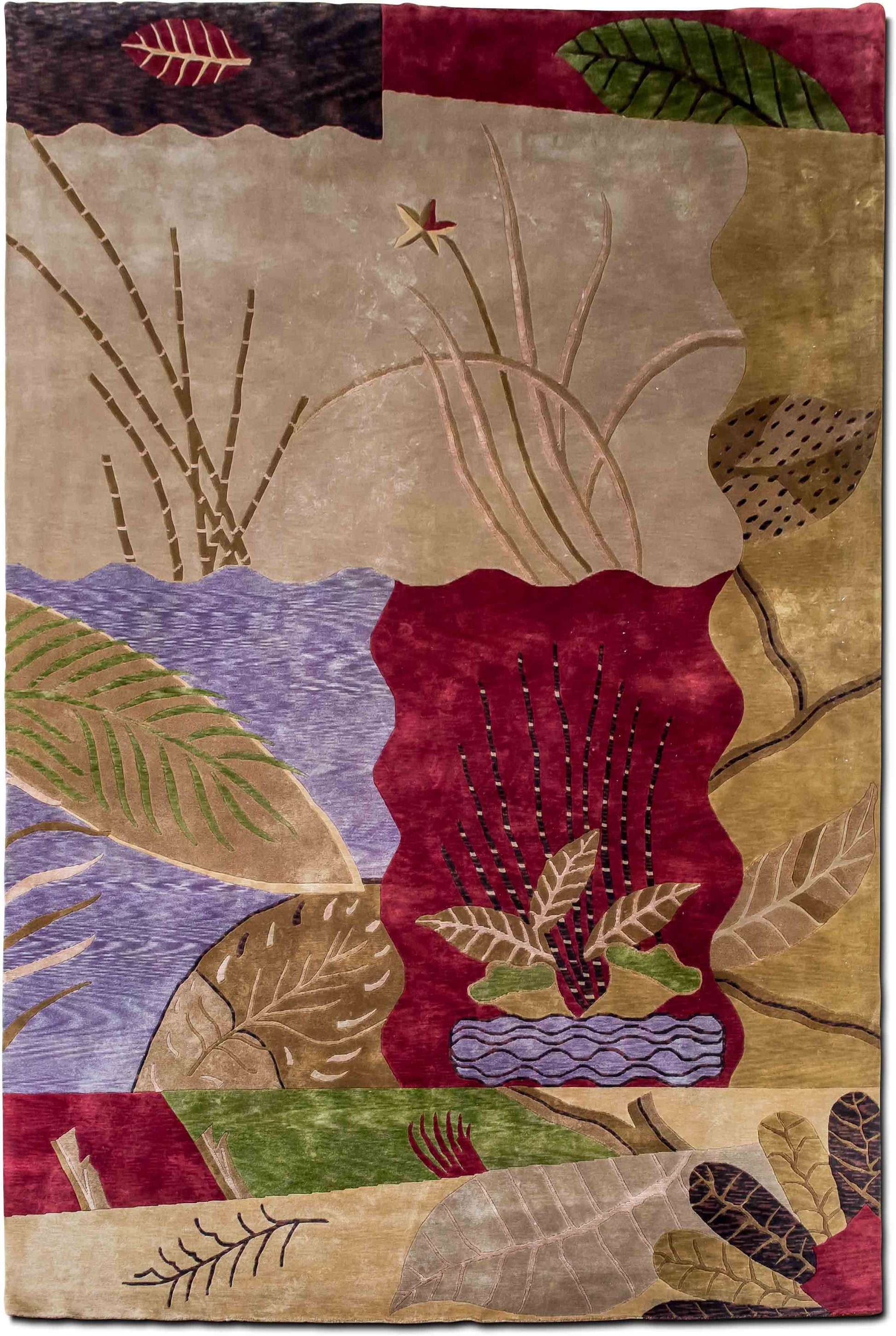 Lush, tropical, and full of personality, this bold botanical rug transforms any room into a vibrant oasis. Abstracted leaves and florals in saturated tones of crimson, violet, sage, and gold are framed by organic curves and textured cut-pile detailing for a rich, dimensional look.