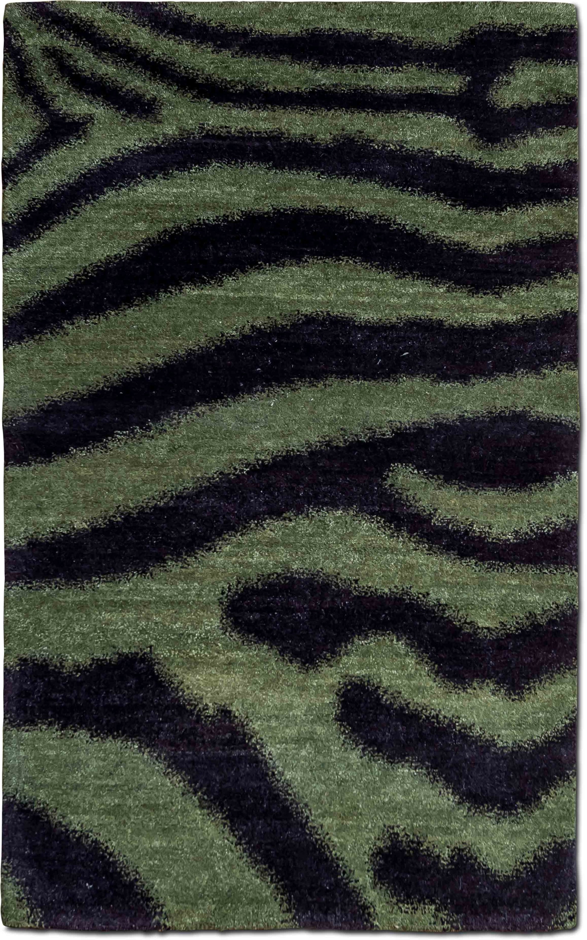Unleash bold sophistication with this hand-knotted Tufenkian wool rug, featuring a dynamic zebra-inspired pattern in deep black and earthy olive green. The organic, flowing lines create a sense of movement and energy, ideal for modern interiors that embrace statement design.