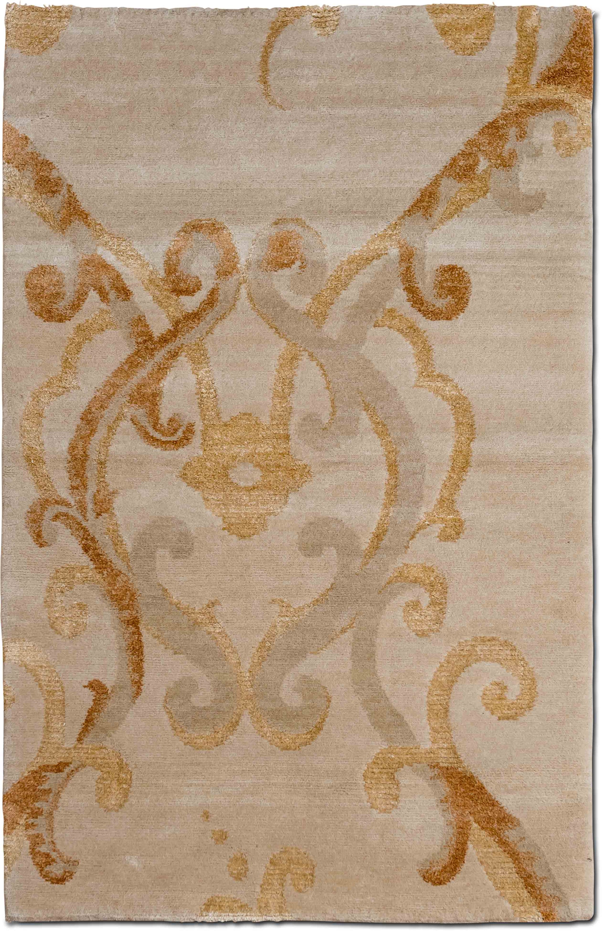 A modern floral Shakti weave rug in elegant beige tones. Assumed Arabesque Brulee is asymmetrical and unexpected. A modern, floral motif that shimmers off the confines of the carpet in elegant silk and our finest wool. This rug was hand knotted in Nepal using our premium Shakti quality construction which has a pile height of about 0.28 inches and a smooth, soft finish. Assumed Arabesque Brulee is a grounding carpet in camel brown wool and shimmering copper accents. This rug has a high silk content with 30% used for the ornate design.