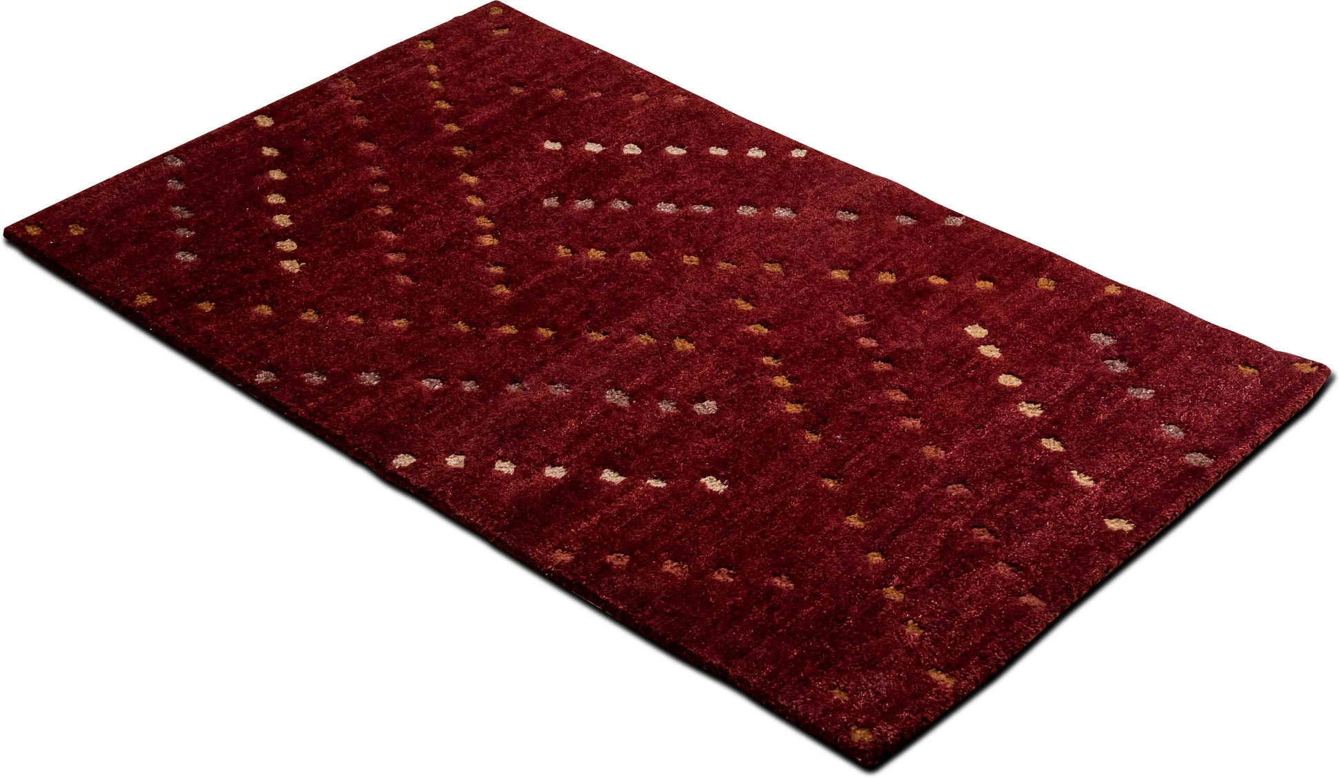 Add a bold yet refined touch to your interior with this hand-knotted Tufenkian wool rug, featuring a rich burgundy field accented by an array of scattered, multi-tone dots in amber, ivory, and slate. The dotted motif dances across the surface in a diagonal rhythm, lending movement and modern sophistication to the design.